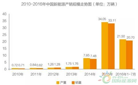 2010-2015年,我国新能源汽车产销规模逐年增长,且增长速度较快。2015年新能源汽车产销340471辆和331092辆,同比分别增长3.3倍和3.4倍。2016年1-7月,新能源汽车产销21.5万辆和20.7万辆,同比增长119.8%和122.8%。