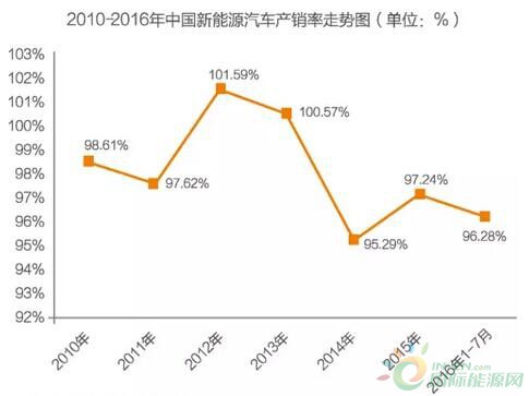 2010-2016年,我国新能源汽车产销率呈现波动性,范围在95%-102%之间。2015年,我国新能源汽车产销率97.24%,较上年相比增长1.95个百分点。2016年1-7月,新能源汽车产销率有所下降,为96.28%,较2015年底相比下降0.96个百分点。