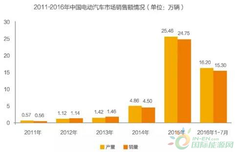 2011-2015年,我国纯电动汽车产销规模大幅增加。2015年,纯电动汽车产销254633辆和247482辆,同比增长4.2倍和4.5倍。2016年1-7月,纯电动汽车产销16.2万辆和15.3万辆,同比增长156.4%和160.9%。