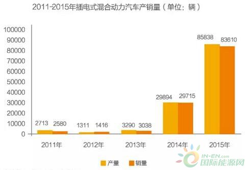 据不完全统计,2014年插电式混合动力汽车产销分别完成29894辆和29715辆;2015年插电式混合动力汽车产销分别完成85838辆和83610辆,比上年分别增长1.87倍和1.81倍。总体来看,混合动力汽车在我国的市场表现在2015年十分亮眼。