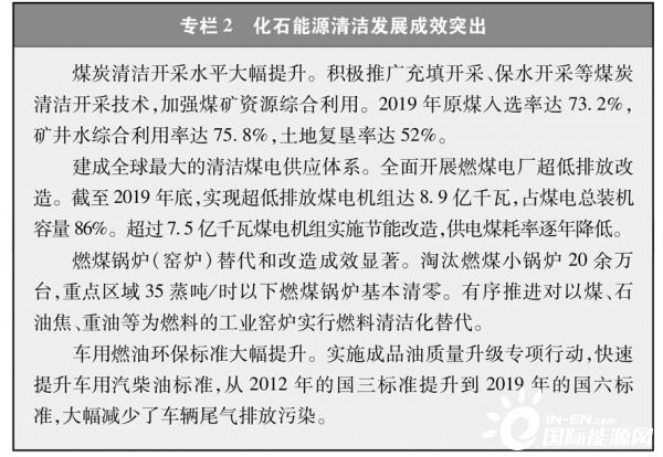 中国把推进能源绿色发展作为促进生态文明建设的重要举措,坚决打好污染防治攻坚战、打赢蓝天保卫战。煤炭清洁开采和利用水平大幅提升,采煤沉陷区治理、绿色矿山建设取得显著成效。落实修订后的《大气污染防治法》,加大燃煤和其他能源污染防治力度。推动国家大气污染防治重点区域内新建、改建、扩建用煤项目实施煤炭等量或减量替代。能源绿色发展显著推动空气质量改善,二氧化硫、氮氧化物和烟尘排放量大幅下降。能源绿色发展对碳排放强度下降起到重要作用,2019年碳排放强度比2005年下降48.1%,超过了2020年碳排放强度比2005年下降40%-45%的目标,扭转了二氧化碳排放快速增长的局面。