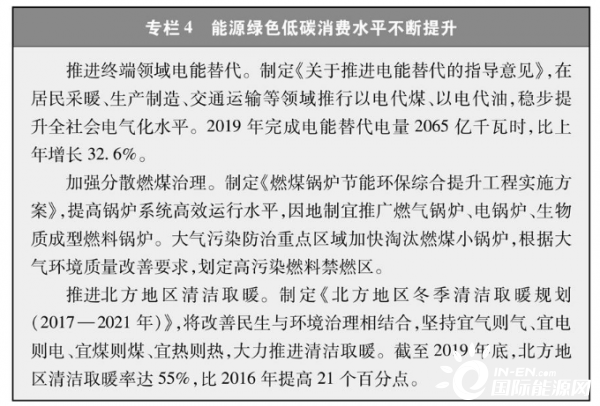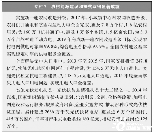 把保障和改善民生作为能源发展的根本出发点,保障城乡居民获得基本能源供应和服务,在全面建成小康社会和乡村振兴中发挥能源供应的基础保障作用。2016年至2019年,农网改造升级总投资达8300亿元,农村平均停电时间降低至15小时左右,农村居民用电条件明显改善。2013年至2015年,实施解决无电人口用电行动计划,2015年底完成全部人口都用上电的历史性任务。实施光伏扶贫工程等能源扶贫工程建设,优先在贫困地区进行能源开发项目布局,实施能源惠民工程,促进了贫困地区经济发展和贫困人口收入增加。完善天然气利用基础设施建设,扩大天然气供应区域,提高民生用气保障能力。北方地区清洁取暖取得明显进展,改善了城乡居民用能条件和居住环境。截至2019年底,北方地区清洁取暖面积达116亿平方米,比2016年增加51亿平方米。