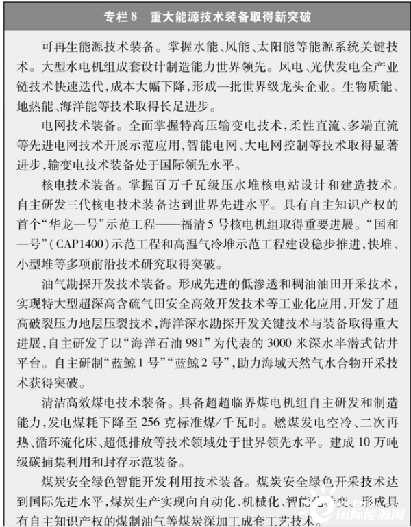 持续推进能源科技创新,能源技术水平不断提高,技术进步成为推动能源发展动力变革的基本力量。建立完备的水电、核电、风电、太阳能发电等清洁能源装备制造产业链,成功研发制造全球最大单机容量100万千瓦水电机组,具备最大单机容量达10兆瓦的全系列风电机组制造能力,不断刷新光伏电池转换效率世界纪录。建成若干应用先进三代技术的核电站,新一代核电、小型堆等多项核能利用技术取得明显突破。油气勘探开发技术能力持续提高,低渗原油及稠油高效开发、新一代复合化学驱等技术世界领先,页岩油气勘探开发技术和装备水平大幅提升,天然气水合物试采取得成功。发展煤炭绿色高效智能开采技术,大型煤矿采煤机械化程度达98%,掌握煤制油气产业化技术。建成规模最大、安全可靠、全球领先的电网,供电可靠性位居世界前列。“互联网+”智慧能源、储能、区块链、综合能源服务等一大批能源新技术、新模式、新业态正在蓬勃兴起。