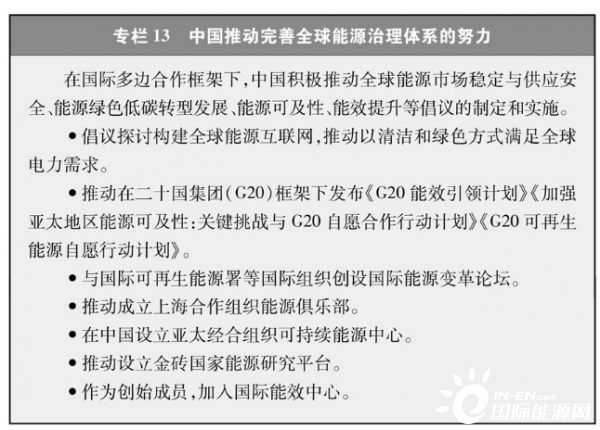 融入多边能源治理。积极参与联合国、二十国集团、亚太经合组织、金砖国家等多边机制下的能源国际合作,在联合研究发布报告、成立机构等方面取得积极进展。中国与90多个国家和地区建立了政府间能源合作机制,与30多个能源领域国际组织和多边机制建立了合作关系。2012年以来,中国先后成为国际可再生能源署成员国、国际能源宪章签约观察国、国际能源署联盟国等。