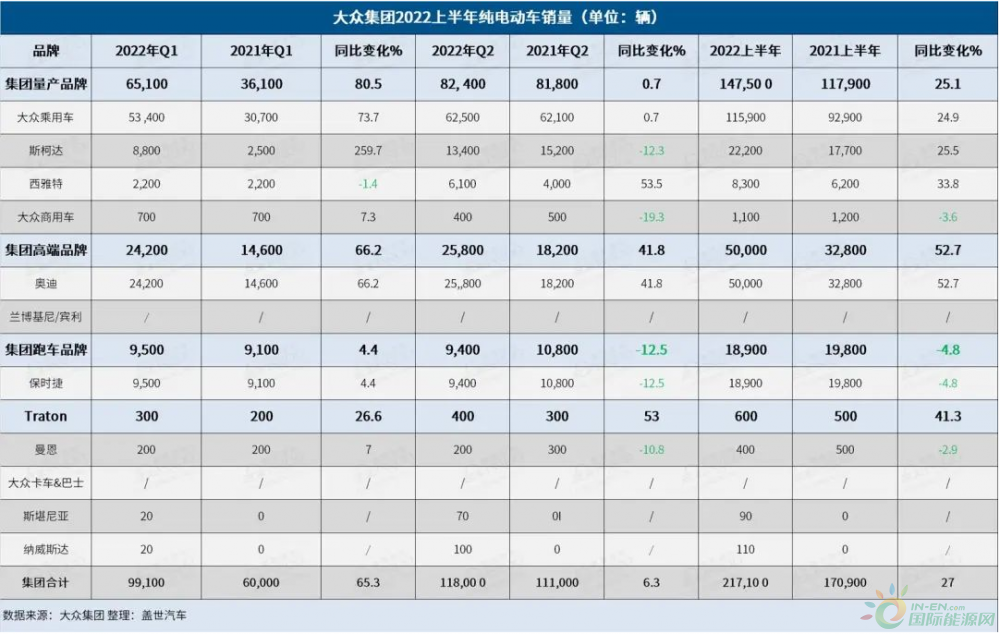 就各品牌的纯电动汽车销量来看,今年上半年,大众品牌共向全球客户交付了115,900辆纯电动汽车,占集团纯电动汽车总交付量的53%;奥迪以50,000辆的纯电动汽车交付量排在第二,占据集团纯电动汽车交付总量的23%;斯柯达售出了22,200辆纯电动车,占集团纯电动汽车交付总量的10%;保时捷贡献了18,900辆(9%)纯电动车交付量,西雅特/CUPRA贡献了8,300辆(4%)。