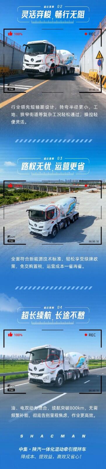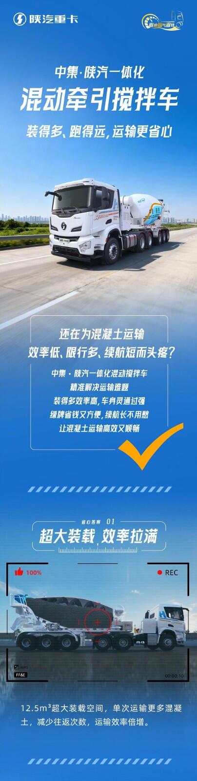 中集·陕汽一体化混动搅拌车,精准解决运输难题,装得多,效率高,车身灵,通过强,绿牌省钱又方便,续航长不用愁,让混凝土运输高效又顺畅。