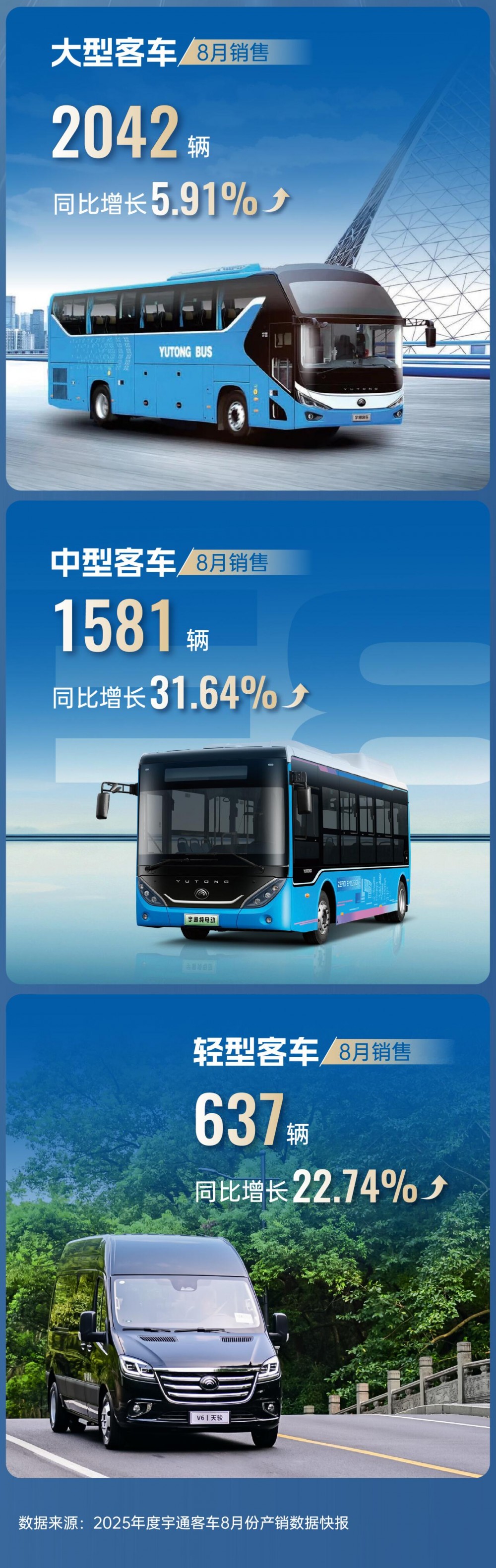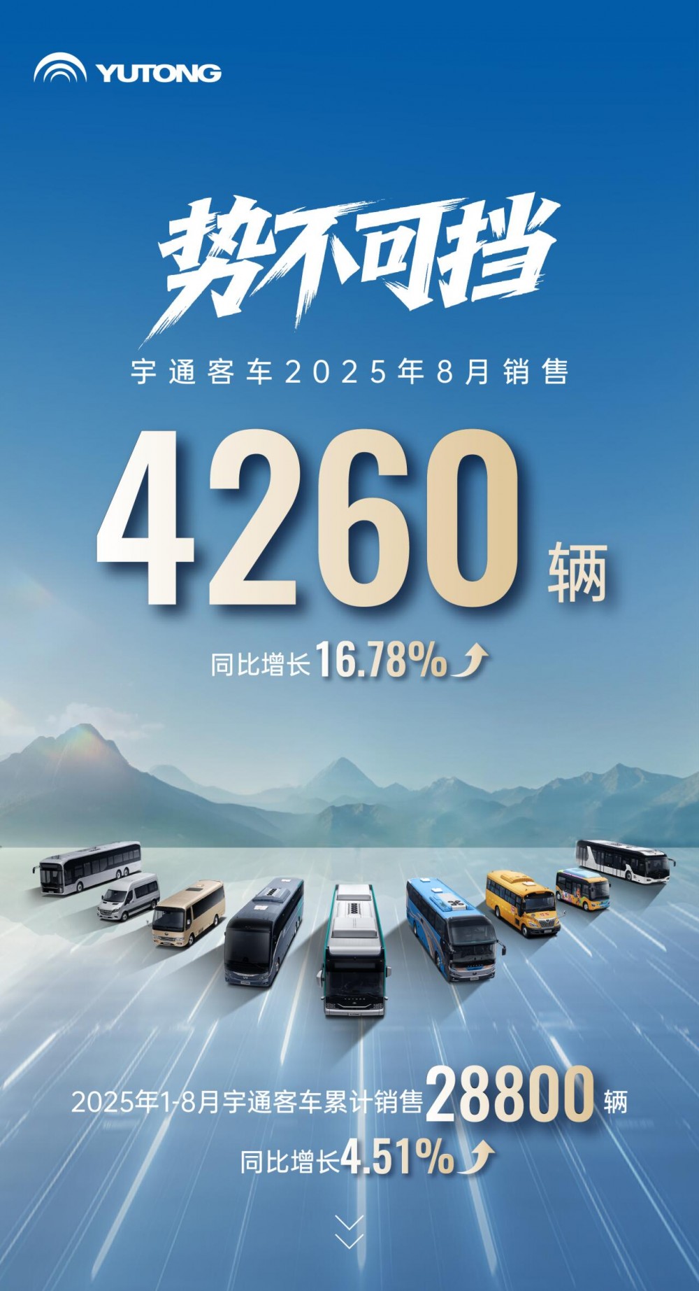宇通客车8月销量4260辆,同比增长16.78%,2025年1-8月宇通客车累计销售28800辆,同比增长4.51%