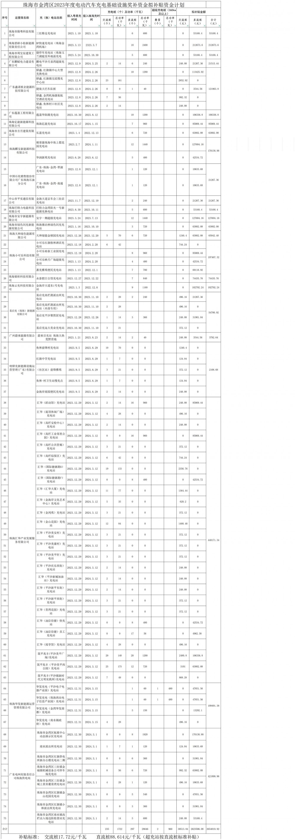 根据《广东省能源局关于做好 2023 年度电动汽车充电基础设施建设项目核实及奖补资金安排的通知》(粤能电力函〔2024〕500号)及《珠海市发展和改革局关于2023年度珠海市电动汽车充电基础设施专项补贴的通知》等相关文件要求,金湾区发展和改革局组织开展了2023年度电动汽车充电基础设施奖补资金申报及核查工作。经企业申报、资料审核、现场核查等程序,现对经审核后符合申领补贴条件的24家企业共75个充电基础设施站点提出拟补贴资金计划并予以公示(详见附件),公示期为公示之日起三个工作日,公示期满如无异议,将按公示金额组织进行补贴发放相关事宜。