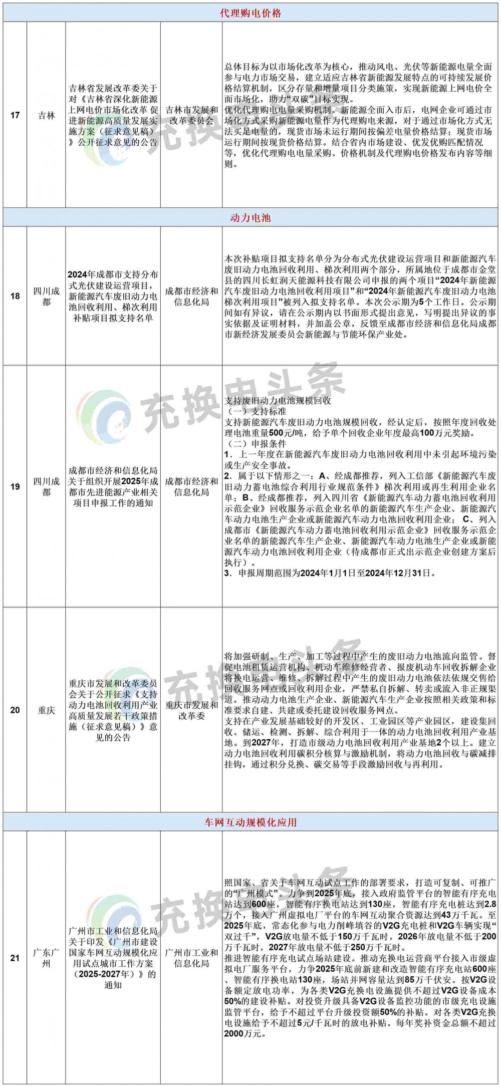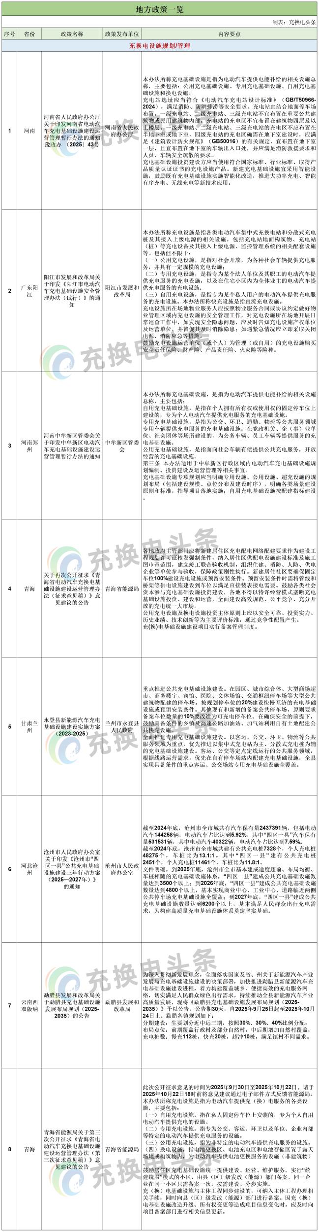 充换电设施规划/管理:河南、河南郑州、广东阳江、青海、甘肃兰州、河北沧州、云南西双版纳等地共发布8条。