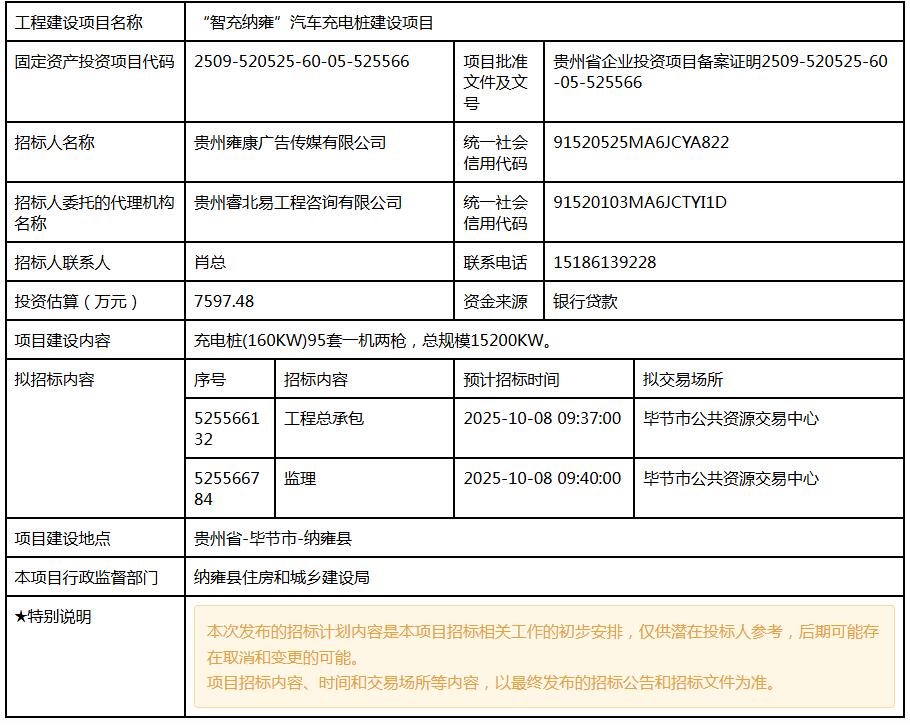 “智充纳雍”汽车充电桩建设项目项目招标计划
