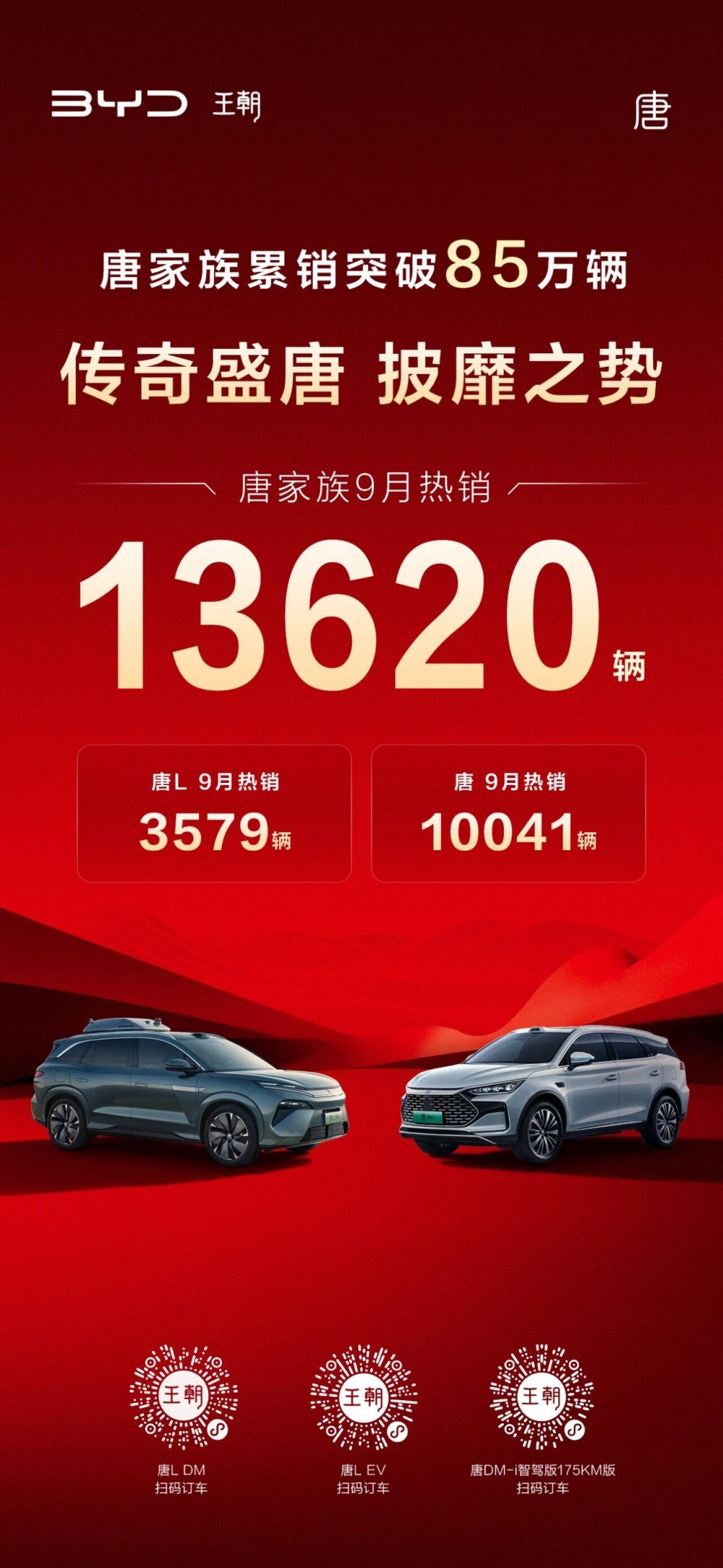 唐家族9月热销13620辆,累计销量突破85万辆,科技智慧,尊崇体验,匠心品质,共鉴非凡。