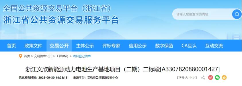 充换电头条获悉,近日,浙江省义乌市公共资源交易中心发布了浙江义欣新能源动力电池生产基地项目(二期)二标段招标公告。