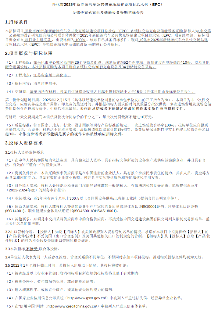 11月12日,江苏泰兴兴化市乡镇快充站充电及储能设备采购,据悉项目规划新建约52个充电站、充电终端约410根,本次招标范围为所有乡镇快充站36套充电设备及34套储能设备采购。