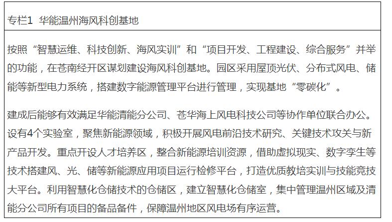 构建风电全产业链生态。加快绿能小镇、远景苍南零碳产业基地的建设步伐,形成涵盖风机叶片制造、塔筒制造、智能化电气设备研发制造、风机整机和配套设备制造、大型设备物流、研发创新等在内的风电全产业链,建成具有国内国际影响力的海上风电装备制造基地。谋划具备海上风电基础模块制造、风机及基础总装、施工建设、运维服务、研发试验等功能的风电枢纽,推动海上风电产业向高效率、高技术和高价值方向发展,促进海上风电可持续发展。加强海上风电等配套服务设施建设,推进华能温州海风科创基地建设,形成集海上风电科技创新、海风培训等功能为一体的综合性多功能服务基地,有效保障海上风电资源利用。