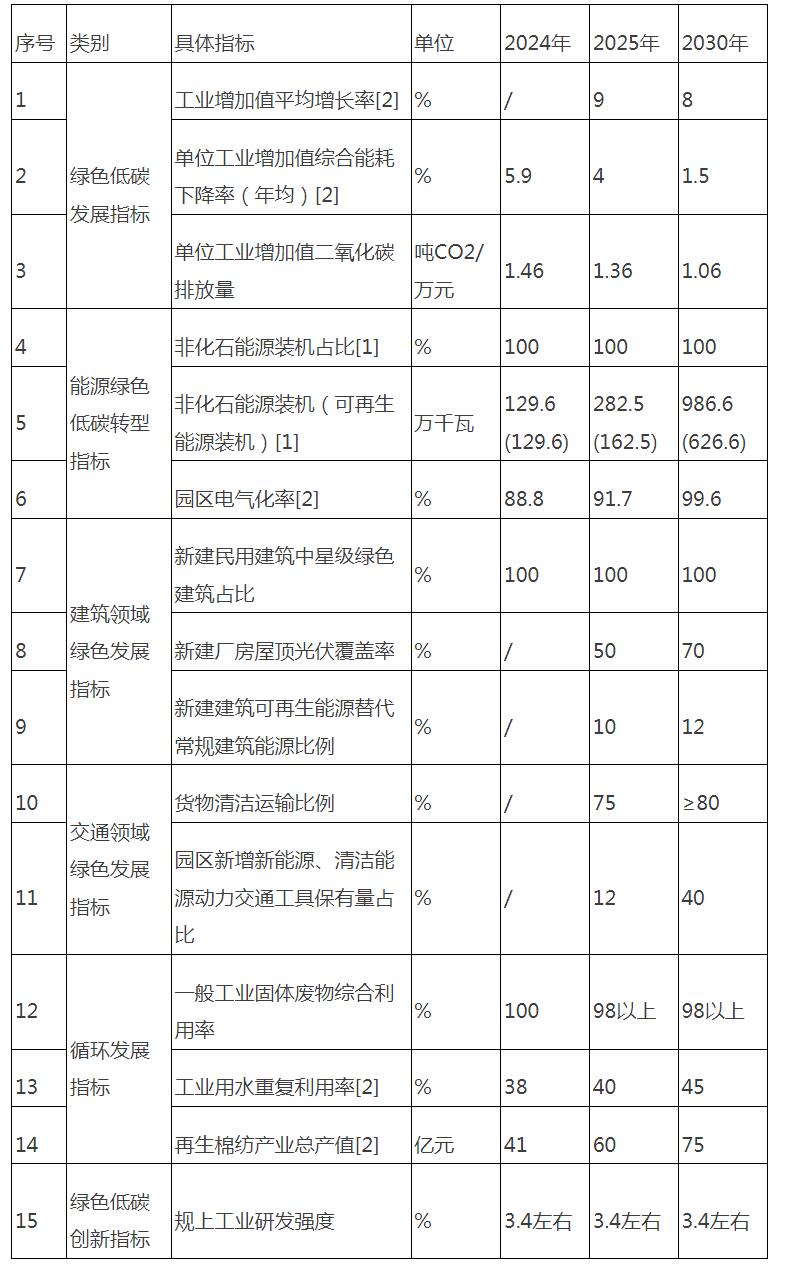 产业转型提质发展引领示范。到2030年,纺织业、橡胶塑料业、建材等行业单位工业增加值二氧化碳排放较2024年下降20%以上,清洁能源产业总产值达到330亿元,清洁能源装机容量达到1000万千瓦。高新技术产业占规上工业增加值比重达到62%;战略性新兴产业占规上工业增加值比重达到55%。